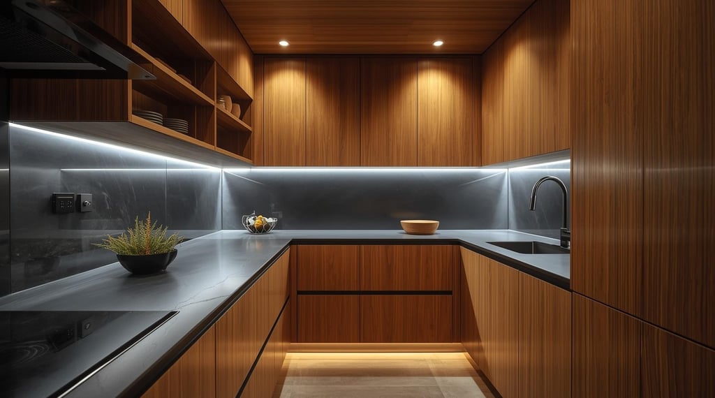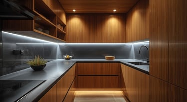 Esta cocina se define por un lenguaje envolvente donde la madera de tono profundo crea una atmósfera cálida y sofisticada. Las vetas verticales aportan continuidad y elegancia, mientras que la composición en “L” optimiza el espacio con una distribución precisa y funcional. La cubierta en tono oscuro genera un contraste sutil que eleva la percepción del conjunto.