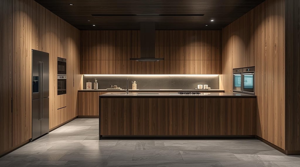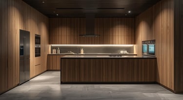 Esta cocina se concibe como un volumen arquitectónico continuo, donde la madera envuelve por completo el espacio generando una estética sólida, uniforme y altamente sofisticada. Las vetas verticales aportan ritmo y profundidad, mientras que la isla central, de proporciones amplias, se posiciona como el elemento protagonista, integrando funcionalidad y presencia con absoluta precisión.