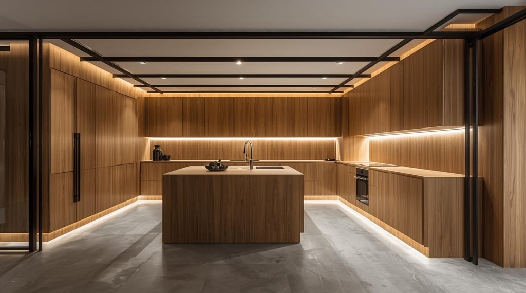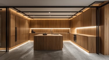 Esta cocina se define por una composición envolvente donde la madera natural domina el espacio con una continuidad impecable. Las líneas limpias y proporciones equilibradas crean un lenguaje arquitectónico sólido, mientras que la isla central se integra como un elemento preciso y funcional que organiza todo el entorno.