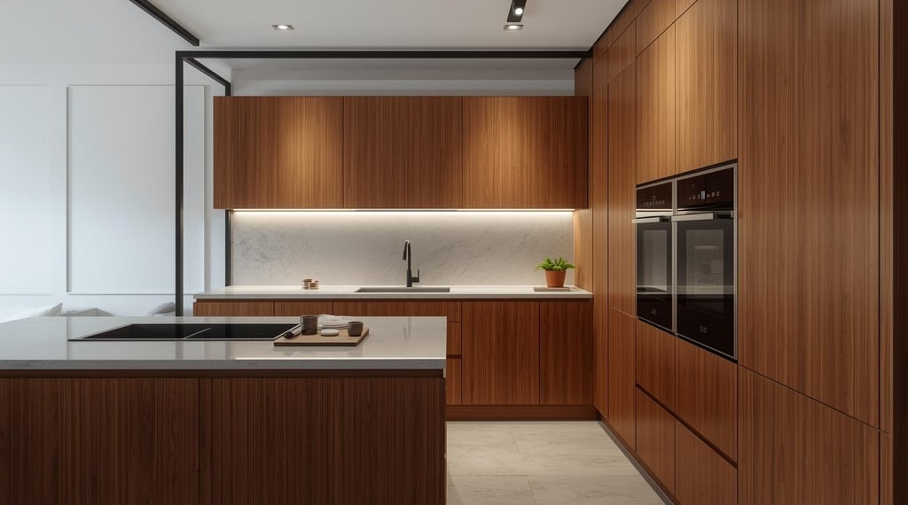 Esta cocina fusiona la calidez de la madera natural con la precisión de la herrería en un lenguaje contemporáneo y sofisticado. Los frentes de veta continua generan una estética limpia y ordenada, mientras que la isla central se establece como el eje del espacio, aportando equilibrio entre funcionalidad y presencia arquitectónica.