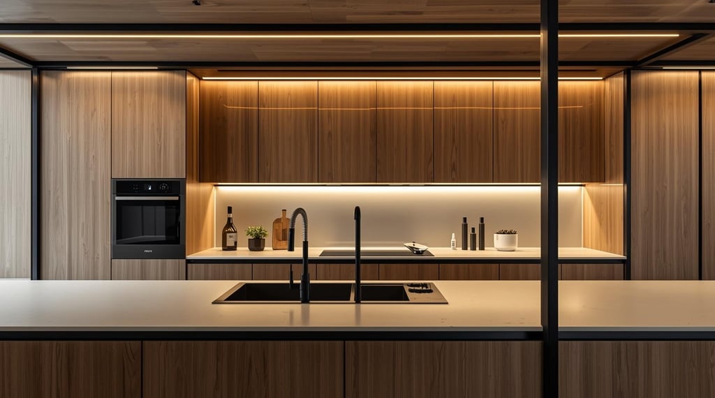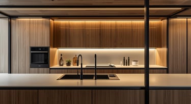 Esta cocina fusiona la calidez de la madera natural con la precisión de la herrería en un lenguaje contemporáneo y sofisticado. Los frentes de veta continua generan una estética limpia y ordenada, mientras que la isla central se establece como el eje del espacio, aportando equilibrio entre funcionalidad y presencia arquitectónica.