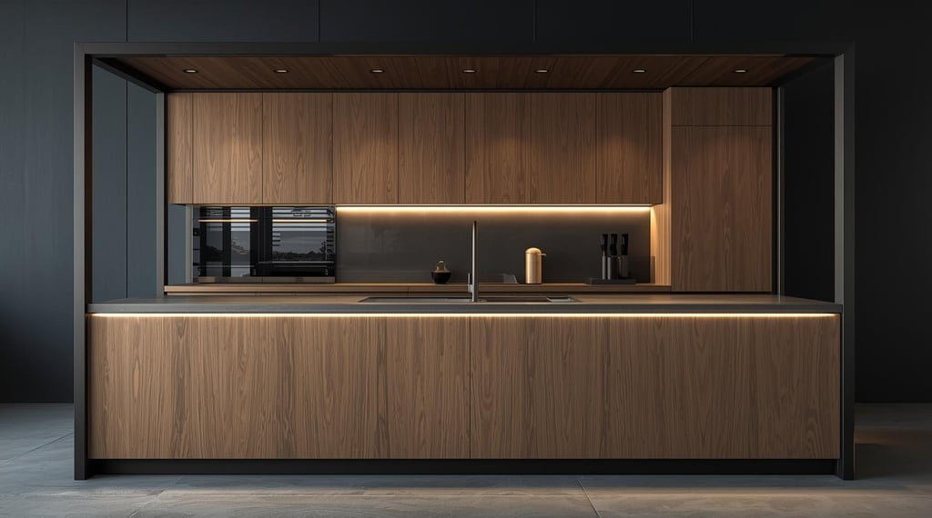 Esta cocina fusiona la calidez de la madera natural con la precisión de la herrería en un lenguaje contemporáneo y sofisticado. Los frentes de veta continua generan una estética limpia y ordenada, mientras que la isla central se establece como el eje del espacio, aportando equilibrio entre funcionalidad y presencia arquitectónica.