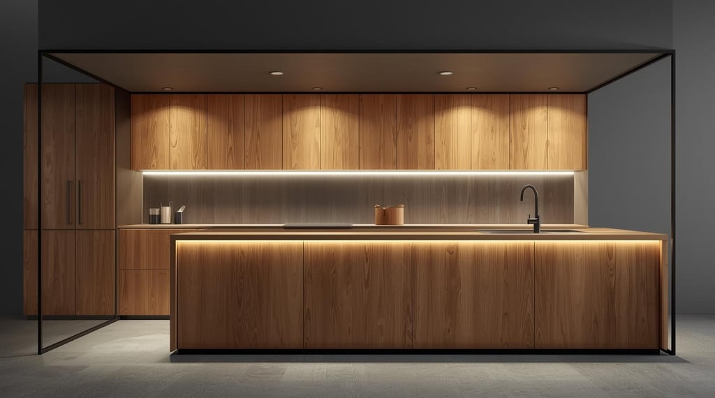 Esta cocina fusiona la calidez de la madera natural con la precisión de la herrería en un lenguaje contemporáneo y sofisticado. Los frentes de veta continua generan una estética limpia y ordenada, mientras que la isla central se establece como el eje del espacio, aportando equilibrio entre funcionalidad y presencia arquitectónica.