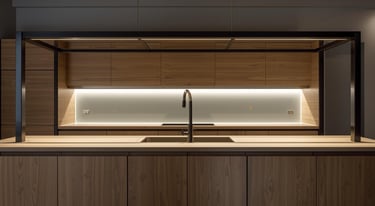 Esta cocina fusiona la calidez de la madera natural con la precisión de la herrería en un lenguaje contemporáneo y sofisticado. Los frentes de veta continua generan una estética limpia y ordenada, mientras que la isla central se establece como el eje del espacio, aportando equilibrio entre funcionalidad y presencia arquitectónica.