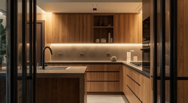 Esta cocina adopta una configuración en “G” que maximiza la funcionalidad dentro de un espacio contenido, envuelta completamente en madera de tono profundo que aporta carácter y sofisticación. Las vetas marcadas y la modulación precisa de los frentes generan un ritmo visual elegante, mientras que las cubiertas claras equilibran el conjunto con un contraste sutil y refinado.